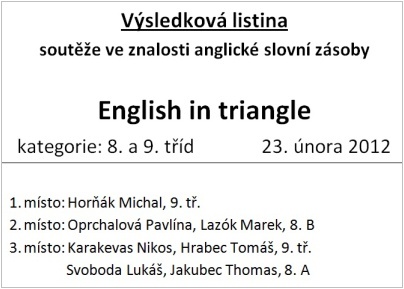 Fotogalerie ŠK Školní klub » ŠK 2011/2012 » English in triangle – starší kategorie Školní klub » ŠK 2011/2012 » English in triangle – starší kategorie